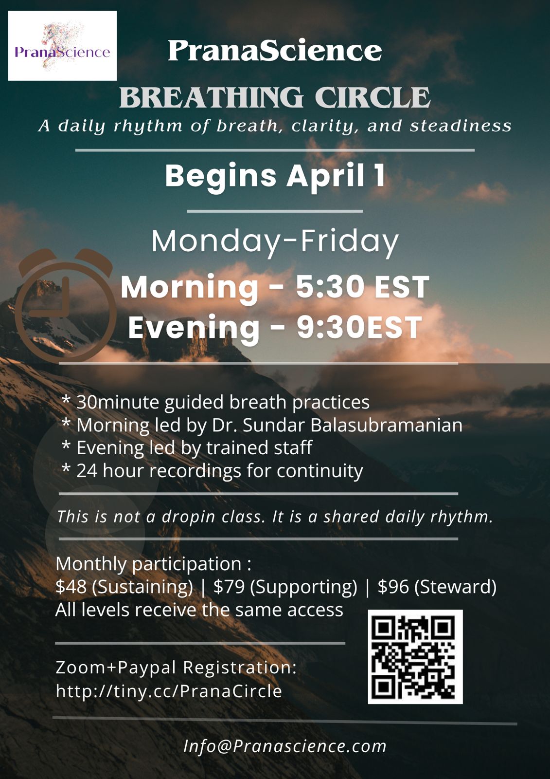 PraṇaScience Breathing Circle A daily rhythm of breath, clarity, and steadiness Breathing Circle is a consistent, community‑supported breath practice space meeting Monday–Friday, morning and evening. This is not a drop‑in class; it is a shared daily rhythm. Meeting date: April 01, 2026 to April 30, 2026 on all Weekdays. Meeting Time: A consistent daily breath practice (Mon–Fri)...