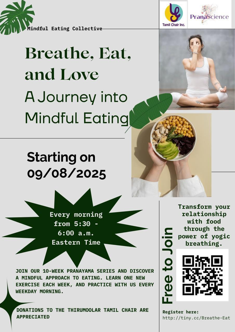 Hello everyone, Eating is not just about what you put into your body, but how you eat it. It’s about bringing awareness to every bite. We are excited to announce a new series on pranayama, a practice that can have profound, positive effects on your lifestyle. Our first module is “Mindful Eating with Pranayama,” a 10-week program that will be held every morning from 5:30 to 6:00 a.m. Eastern Time. Please be sure to check your local time online to join us at the correct time. Each week, we will focus on learning and practicing one new pranayama exercise. We’ll practice together for at least 24 minutes a day, Monday through Friday, giving you the weekends to practice on your own. By the end of this 10-week series, you will discover how your perception of eating has transformed. There is no fee to join this program. However, we sincerely appreciate any donations to the Thirumoolar Tamil Chair to support our work. Don’t stress if you can’t join us bright and early! We’ll post the video on YouTube so you can catch up and practice whenever you want. Come join us and change the way you breathe, eat, and love.